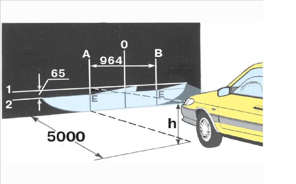 - Дальнее освещение нужно проверять с помощью горизонтальной линии на 5 см выше центральной полосы. Пучок света должен корректироваться по начерченной разметке.