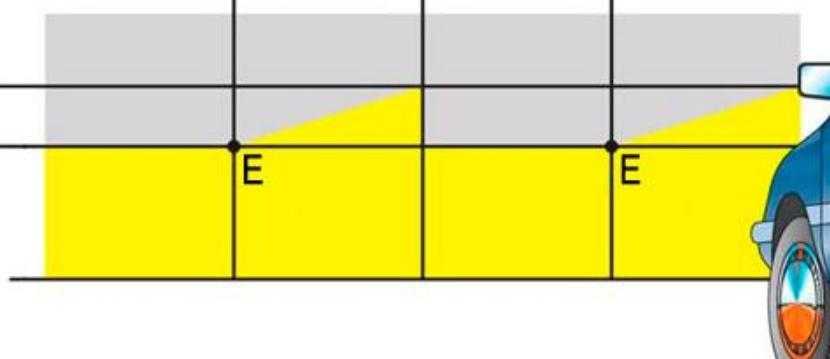Если же нет, то проведите отдельную регулировку дальнего света. Для этого автомобиль отгоните чуть подальше, чтобы расстояние было примерно равно 10 метрам от стены и закрывайте одну из фар тканью. С помощью регулировочных винтов направьте свет фар в перекрестия, образовавшиеся при пересечении линии «1» с вертикальными боковыми линиями в точках «Е» и «Е». Повторите операцию со второй фарой.