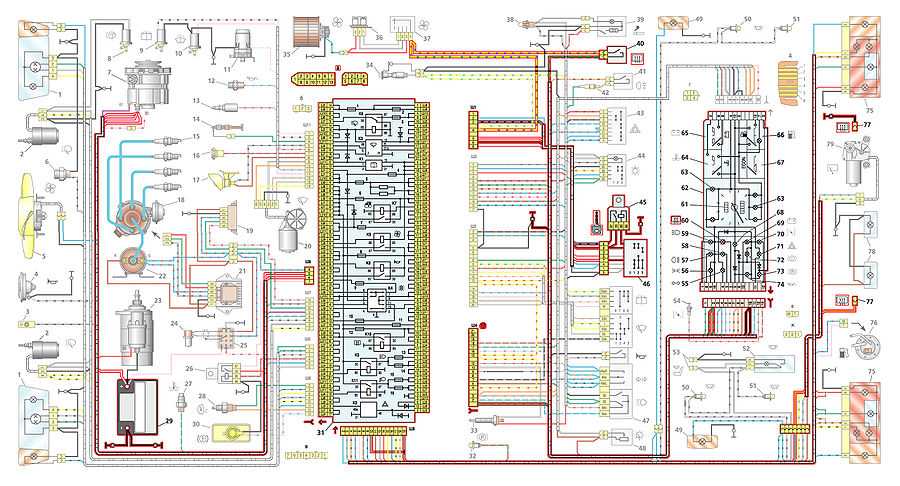 1 – блок-фара; 2 – моторедуктор очистителя фары*; 3 – выключатель подкапотной лампы; 4 – звуковой сигнал; 5 – электродвигатель вентилятора системы охлаждения двигателя; 6 – датчик включения электродвигателя вентилятора; 7 – генератор; 8 – электромагнитный клапан включения омыва фар*; 9 – электромагнитный клапан включения омыва заднего стекла* (на ВАЗ-21099 не устанавливается); 10 – электромагнитный клапан включения омыва ветрового стекла; 11 – электродвигатель омывателя стекол; 12 – датчик контрольной лампы давления масла; 13 – электромагнитный клапан карбюратора; 14 – концевой выключатель карбюратора; 15 – свечи зажигания; 16 – штепсельная розетка для переносной лампы; 17 – подкапотная лампа; 18 – датчик-распределитель зажигания; 19 – блок управления электромагнитным клапаном карбюратора; 20 – моторедуктор очистителя ветрового стекла; 21 – коммутатор; 22 – катушка зажигания; 23 – стартер; 24 – датчик верхней мертвой точки 1-го цилиндра**; 25 – колодка диагностики**; 26 – реле включения стартера; 27 – датчик указателя температуры охлаждающей жидкости; 28 – выключатель света заднего хода; 29 – аккумуляторная батарея; 30 – датчик уровня тормозной жидкости; 31 – монтажный блок; 32 – выключатель контрольной лампы стояночного тормоза; 33 – выключатель стоп-сигнала; 34 – лампа освещения вещевого ящика; 35 – электродвигатель вентилятора отопителя; 36 – дополнительный резистор электродвигателя отопителя; 37 – переключатель вентилятора отопителя; 38 – лампа подсветки рычагов отопителя; 39 – прикуриватель; 40 – выключатель обогрева заднего стекла; 41 – выключатель заднего противотуманного света; 42 – предохранитель цепи противотуманного света; 43 – выключатель аварийной сигнализации; 44 – выключатель наружного освещения; 45 – реле зажигания; 46 – выключатель зажигания; 47 – подрулевой переключатель; 48 – выключатель освещения приборов; 49 – боковой указатель поворота; 50 – выключатель плафона на стойке передней двери; 51 – выключатель плафона на стойке задней двери (на ВАЗ-2108 и ВАЗ-21083 – не устанавливались); 52 – плафон; 53 – колодки для подключения к плафону индивидуального освещения салона; 54 – выключатель контрольной лампы воздушной заслонки карбюратора; 55 – контрольная лампа указателей поворота; 56 – контрольная лампа наружного освещения; 57 – контрольная лампа заднего противотуманного света; 58 – резервная контрольная лампа; 59 – контрольная лампа дальнего света фар; 60 – контрольная лампа обогрева заднего стекла; 61 – спидометр; 62 – комбинация приборов; 63 – лампы освещения комбинации приборов; 64 – указатель температуры охлаждающей жидкости; 65 – вольтметр; 66 – указатель уровня топлива с контрольной лампой резерва; 67 – эконометр; 68 – лампа табло «STOP»; 69 – контрольная лампа заряда аккумуляторной батареи; 70 – контрольная лампа воздушной заслонки карбюратора; 71 – контрольная лампа аварийной сигнализации; 72 – контрольная лампа уровня тормозной жидкости; 73 – контрольная лампа стояночного тормоза; 74 – контрольная лампа давления масла; 75 – задний фонарь; 76 – датчик указателя уровня и резерва топлива; 77 – колодки для подключения к элементу обогрева заднего стекла; 78 – фонари освещения номерного знака; 79 – моторедуктор очистителя заднего стекла* (на ВАЗ-21099 не устанавливались)