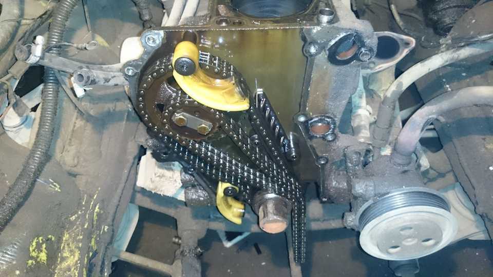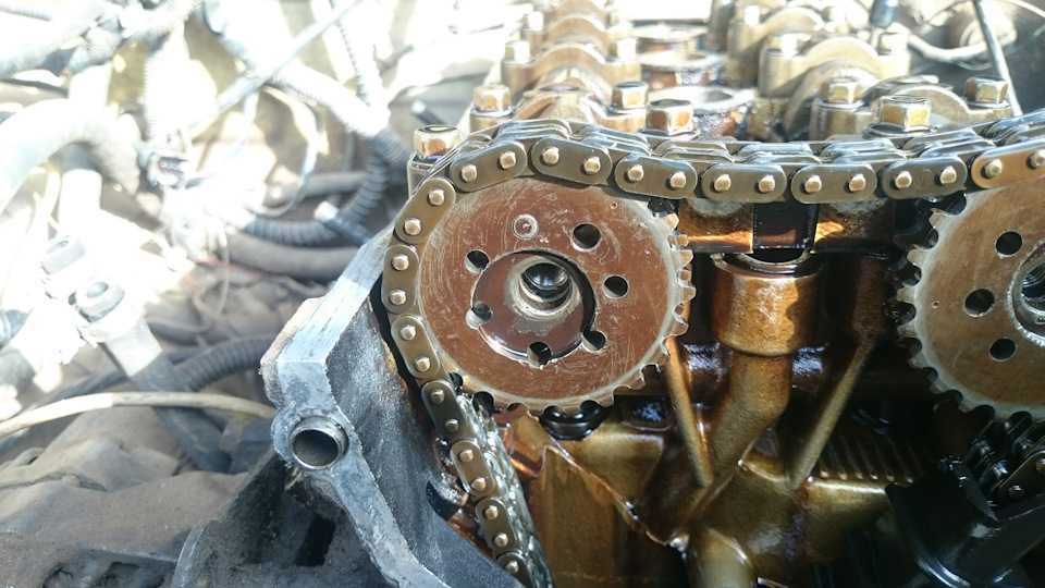 Снимаем клапанную крышку, переднею крышку головки. Теперь нам нужно провернуть мотор, чтобы поставить совместить метки на коленвалу и штифты стояли вровень с «головой». Затем снимаем верхний успокоитель цепи, откручиваем все распредвала и снимаем их. В ролике это всё подробно показывается.