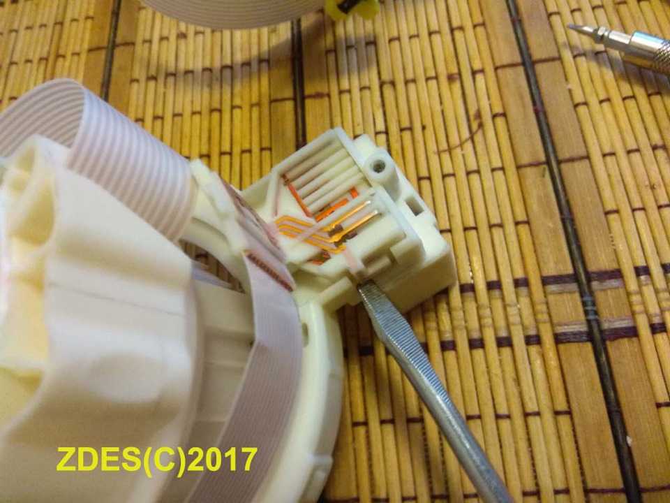 Отверткой поддеваем второй разъем шлейфа и аккуратно вынимаем его из белой крышки.
