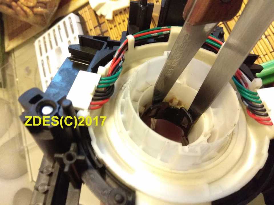 Иногда за подрулевой шлейф Ниссан Кашкая можно взяться собственными руками, без необходимости переустановки. Разберем такой случай – замена рулевого шлейфа может произойти из-за того, что оборвался его край: у переключателя повредилось кольцо, это вполне может произойти из-за низких температур. Берем паяльник и ножик и убираем оставшиеся на контактах порванные части шлейфа. С помощью устройства удастся отделить их от колодки.
