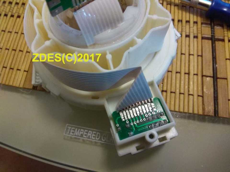 После аккуратно, чтобы не оторвать разъем шлейфа подогнув его внутрь бублика снимаем круглую крышку.Подгибаем дальше разъем еще внутрь