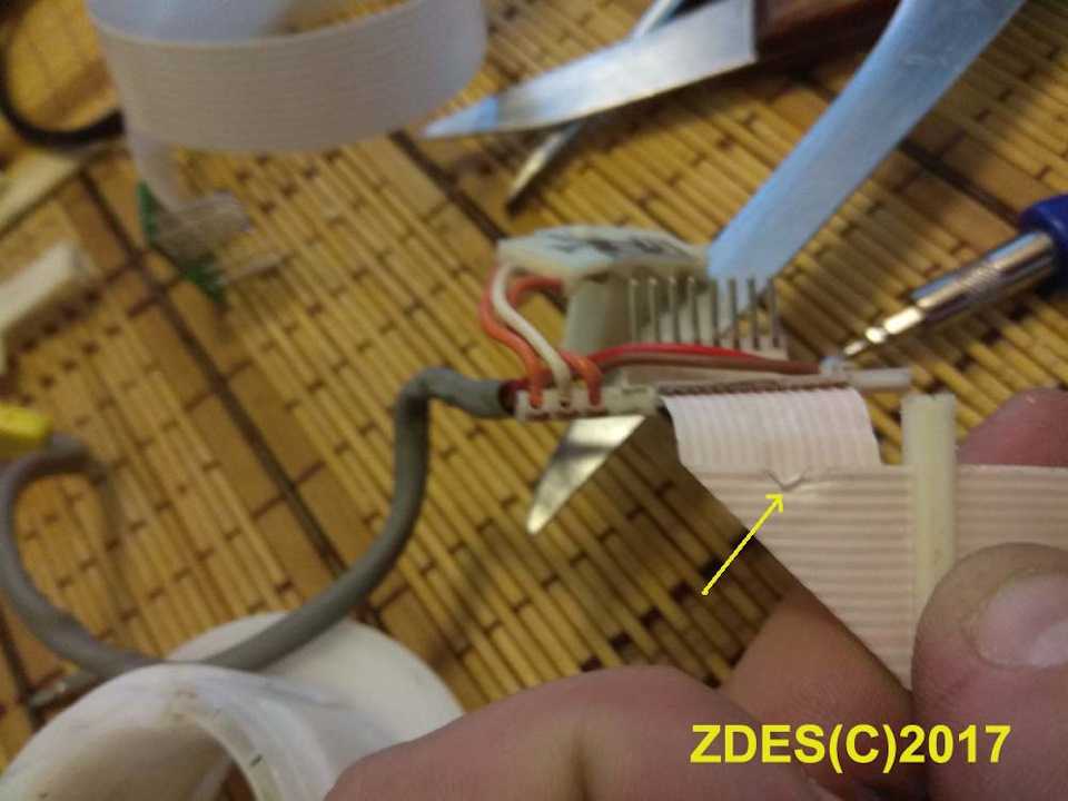 Если произошел обрыв, шлейф поддается ремонту. Соединять концы проводки необходимо при помощи паяльника. Использовать фен нецелесообразно, поскольку он сильно плавит материал. После нанесения припоя на каждую полоску, их необходимо совместить с полосками другого конца. Паять следует аккуратно – тонкая проводка не терпит грубой обработки. Место пайки для повышения прочности обрабатывается клеем (например, Супер Моментом).