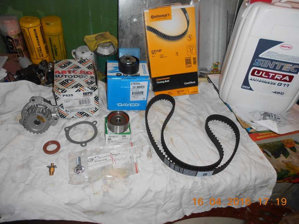 При замене герметика клапанной крышки обнаружил люфт натяжного ролика грм и помпы. Благо запчасти были куплены заранее. Приступаем в ремонту.Нам понадобится1) Ремень ГРМ Contitech CT1137 — 1200р2) Натяжной ролик Dayco ATB2544 — 1500р3) Направляющий ролик INA 532 0091 20 — 1000р4) Болт для ролика направляющего Toyota 90105-10248 — 100р5) Шайба ролика 2108-1006130-10 — 20р6) Помпа Hepu P625 — 1700р7) Антифриз Синтек красный 10 кг — 850р8) Сальник каленвала 21080-1005034-00 — 100р
