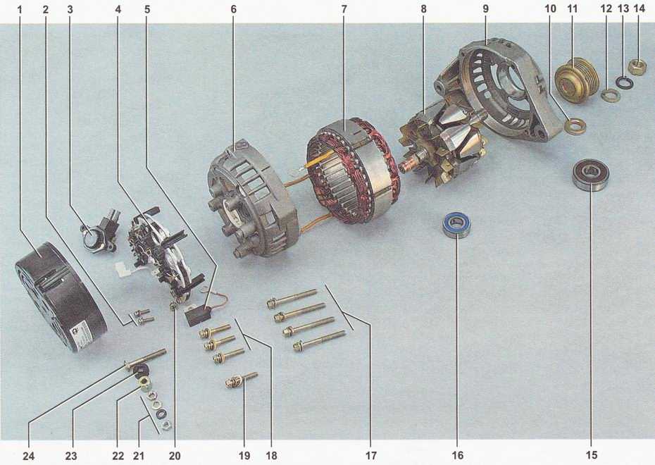 Детали генератора ВАЗ 2110, ВАЗ 2111, ВАЗ 2112: 1 — защитный кожух выпрямительного блока; 2 — винты крепления регулятора напряжения; 4 — выпрямительный блок; 5 — конденсатор; 6 — задняя крышка; 7 — статор с обмотками; 8 — ротор; 9 — передняя крышка; 10 — дистанционная втулка; 11 — шкив; 12 — шайба; 13 — пружинная шайба; 14 — гайка крепления шкива; 15 — передний подшипник; 16 — задний подшипник; 17 — стяжные болты крышек; 18 — болты (с изолирующими прокладками) крепления блока выпрямителей и выводов обмоток статора; 19 — болт (без изолирующей прокладки) крепления блока выпрямителей; 20 — винт крепления конденсатора; 21 — элементы крепления контактного болта; 22 — дистанционная втулка; 23 — изолирующая втулка; 24 — контактный болт