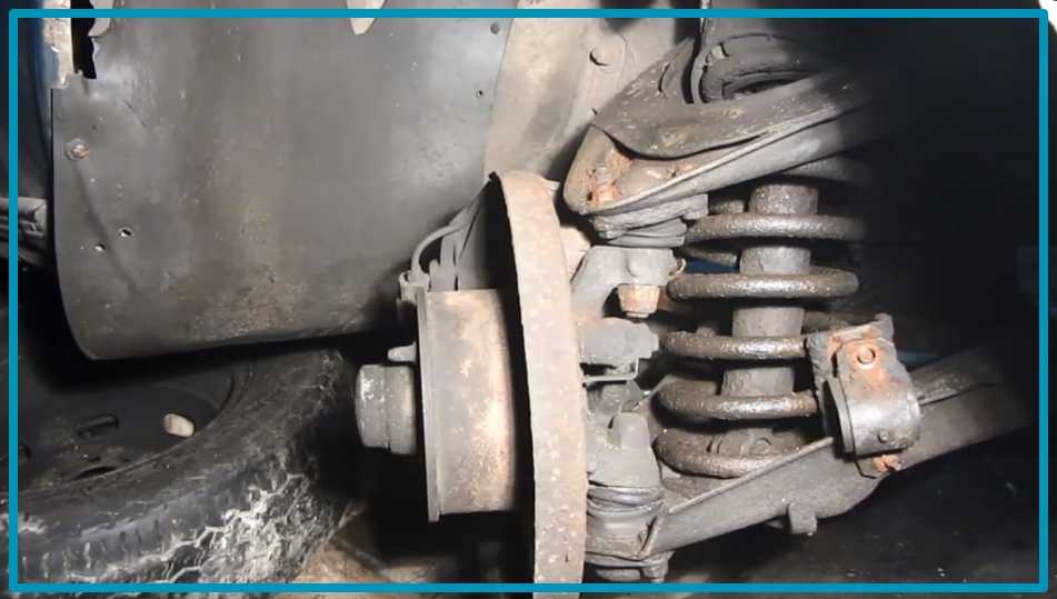 Не забудьте о правилах безопасности и перед работой обязательно поставьте машину на ручник. Теперь можете приступать. Снимите колесо, счистите щеточкой пыль с мест, где находится крепление шаровых опор, смажьте их WD-40.