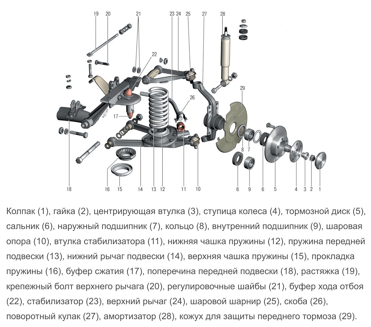 Так же перед ремонтом необходимо изучить расположение элементов ходовой части авто согласно схеме: (обратите внимание на поворотный кулак — позиция 27, подшипник — позиция 9)