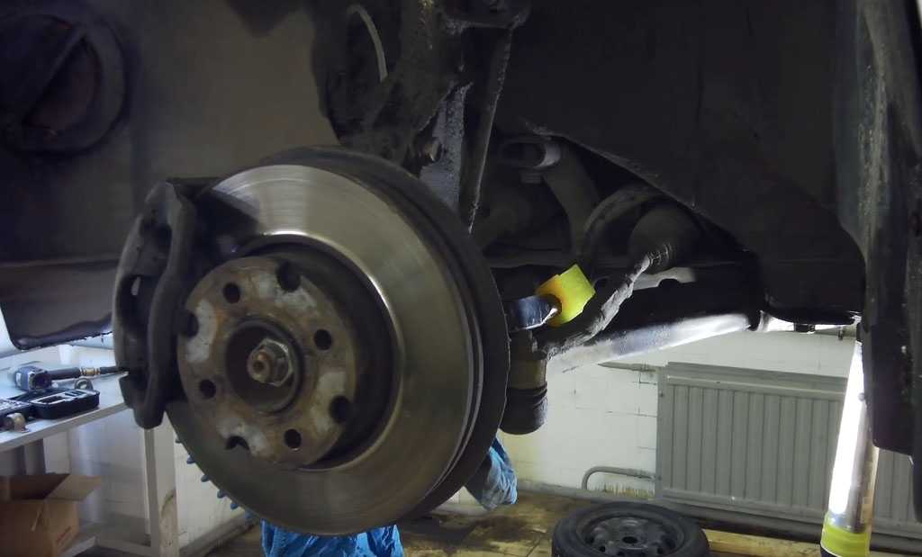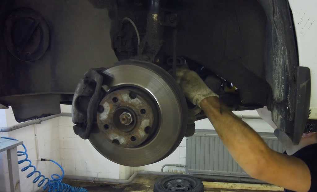 При завершении процедур по подготовке приподнимаем нужную часть транспортного средства домкратом и демонтируем колесо и тормозной механизм. Для удобства тормозной механизм можно не снимать полностью – достаточно лишь открутить верхнее крепления и отпустить нижнее, после чего отвернуть конструкцию в сторону;